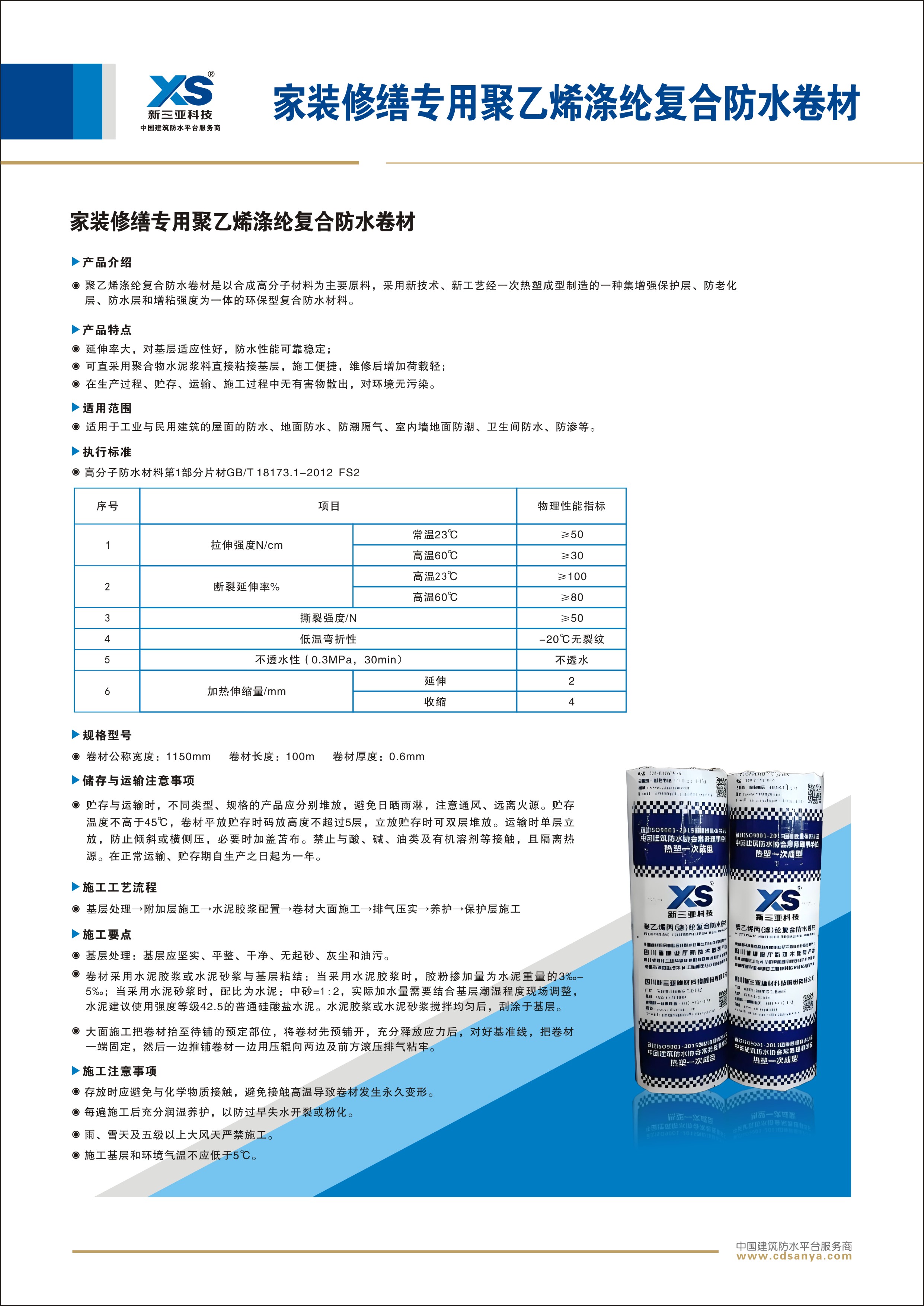 產(chǎn)品簡介: 家裝修繕專用聚乙烯滌綸復(fù)合防水卷材是以合成高分子材料為主要原料,采用新技術(shù)、新工藝經(jīng)一次熱塑成型制造的一種集增強保護(hù)層、防老化層、防水層和增粘強度為一體的環(huán)保型復(fù)合防水材料。 規(guī)格:FS2-PE-50.0m*1.15m*0.60mm |