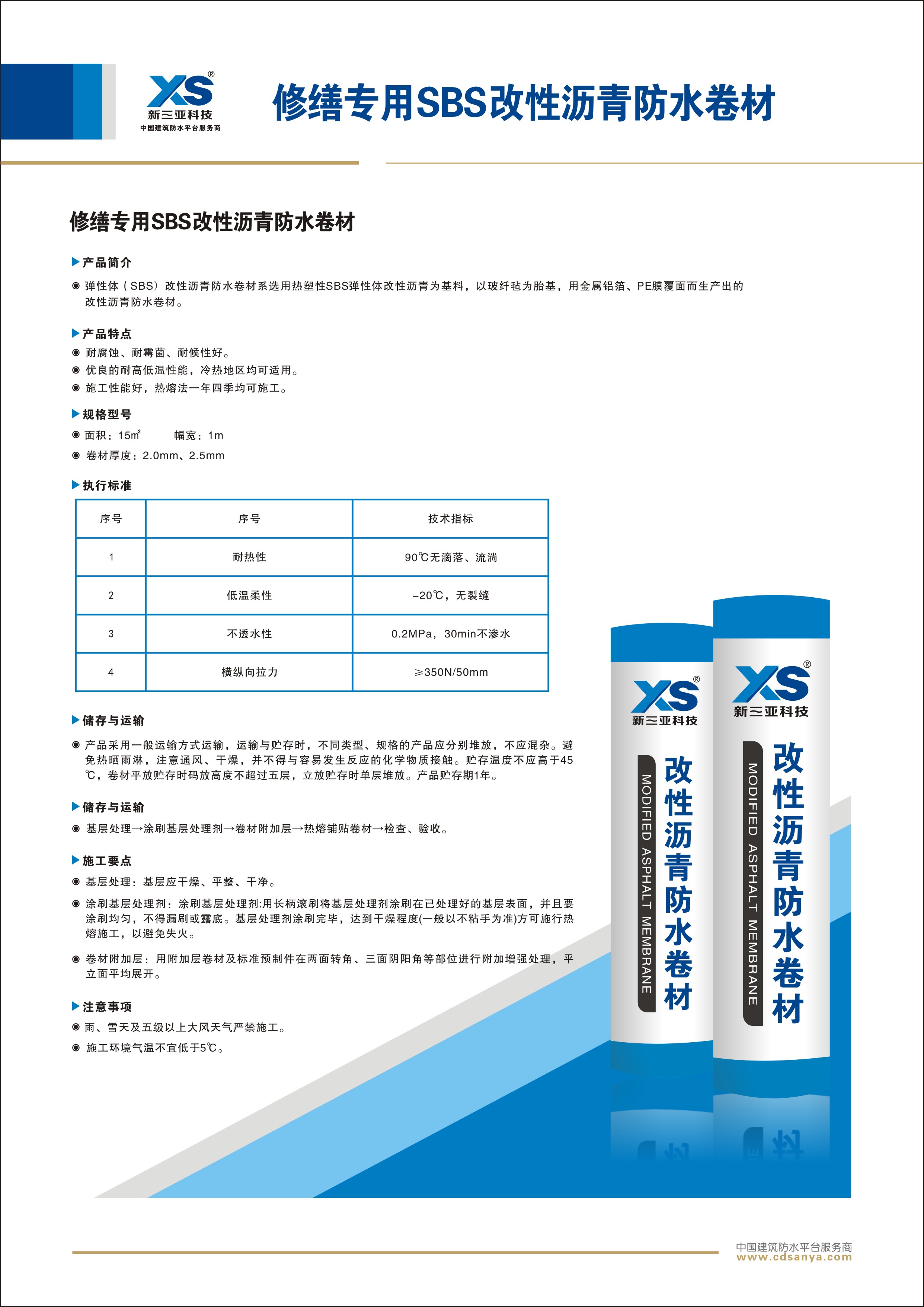 產品簡介: 修繕專用SBS改性瀝青防水卷材,選用彈性體(SBS)改性瀝青為基料使用玻纖氈為胎基,并上、下表面覆PE膜而生產出的改性瀝青防水卷材。 規(guī)格:SBS I G PE PE 2.5mm 1m×15m