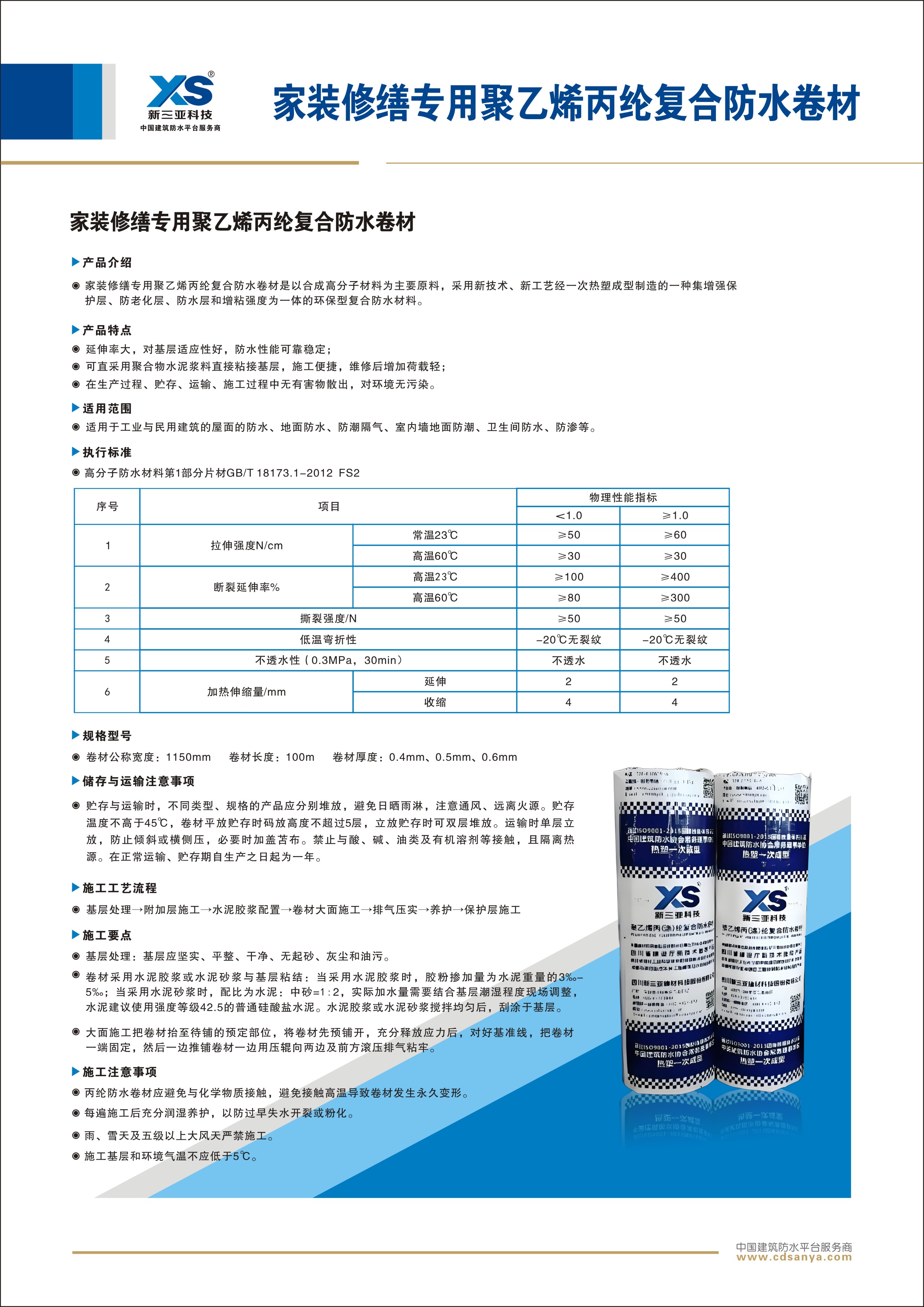 產(chǎn)品簡介: 乙烯丙綸復合防水卷材是以合成高分子材料為主要原料,采用新技術、新工藝經(jīng)一次熱塑成型制造的一種集增強保護層、防老化層、防水層和增粘強度為一體的環(huán)保型復合防水材料。 規(guī)格: FS2-PE-0.4mm 1.15m×100m | ![]() | ![]() |